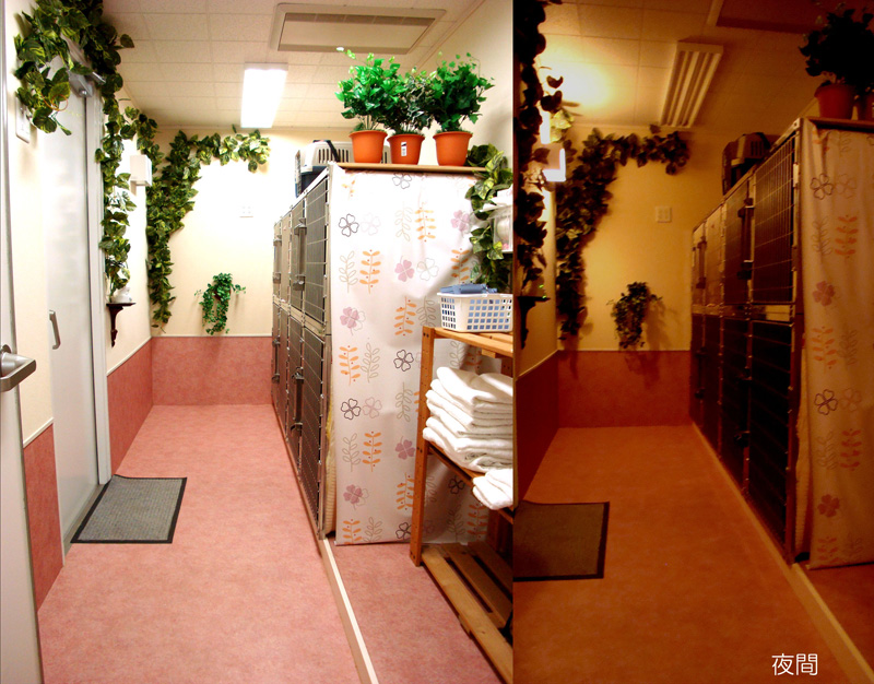 ねこちゃんだけのお部屋です。わんちゃんのお部屋とはなれており、緊張しやすいねこちゃんも安心して過ごすことができます。