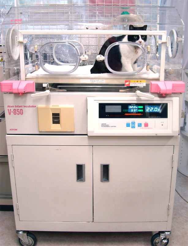 人用の保育器です。帝王切開後の新生子犬や、酸素吸入が必要な小型犬・猫ちゃんの管理を行います。